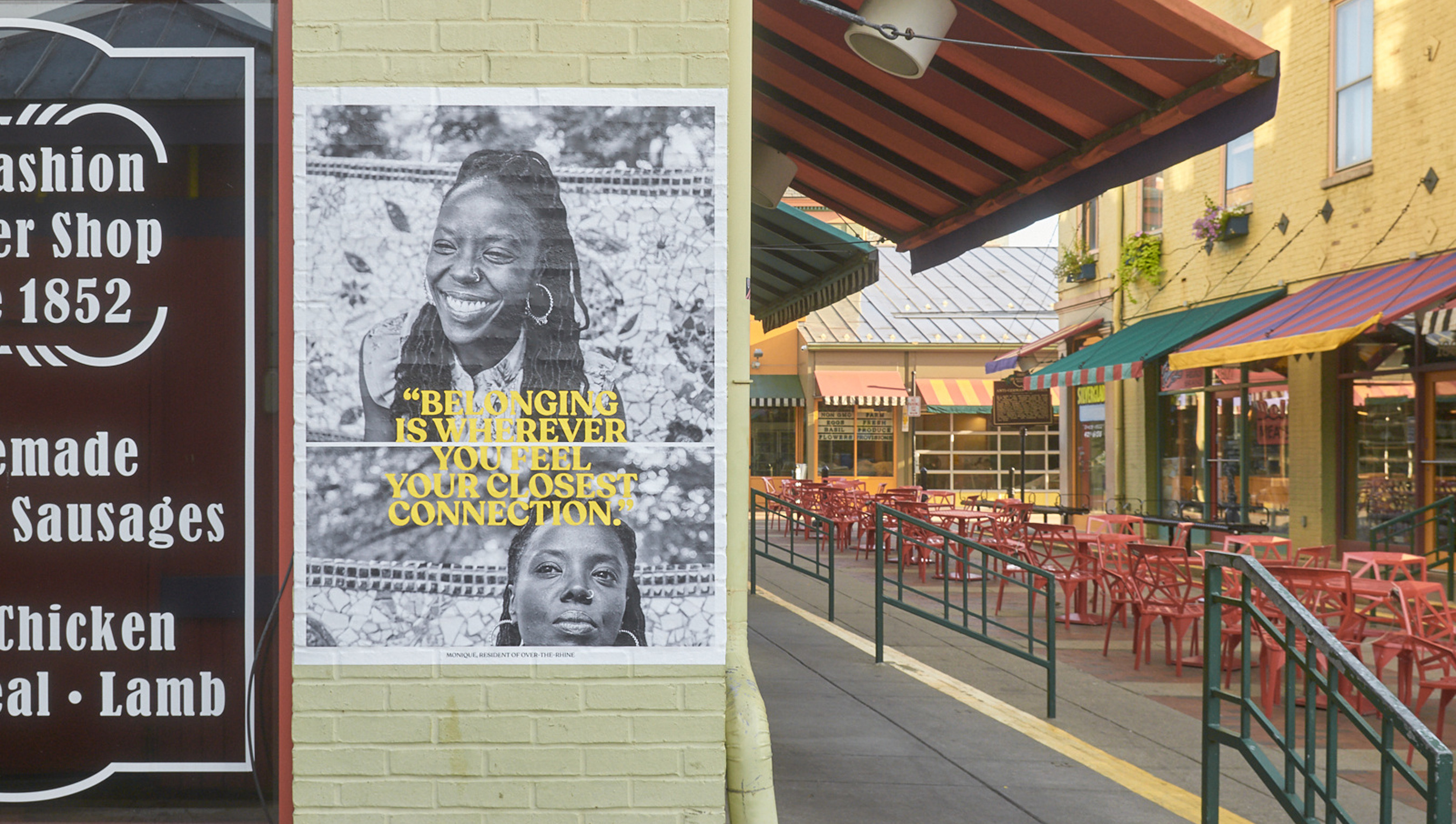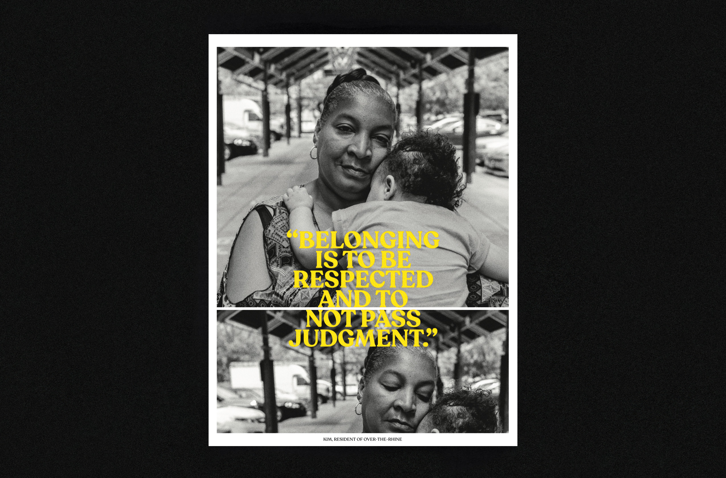 Asa Featherstone IV invited me to help him creatively address the question of belonging in Findlay Market of Cincinnati, Ohio, a part of town shifting as it becomes a tourist destination. We collected stories from local residents and workers, creating posters with their words on belonging. The posters are designed to feel like an extension of the neighborhood, balanced with eye-catching yellow to create energetic contrast.
